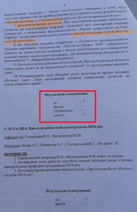 Як стало відомо, Постійна комісія обласної ради з питань використання природних ресурсів ще в 2016 році погодила надання спец.дозволу ТОВ "АЕСУ" на користування надрами в Дніпропетровській області, у Криничанскому і П’ятихатському районах. (див. Фотокопію нижче).