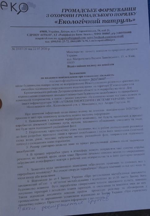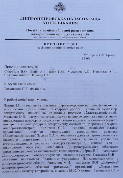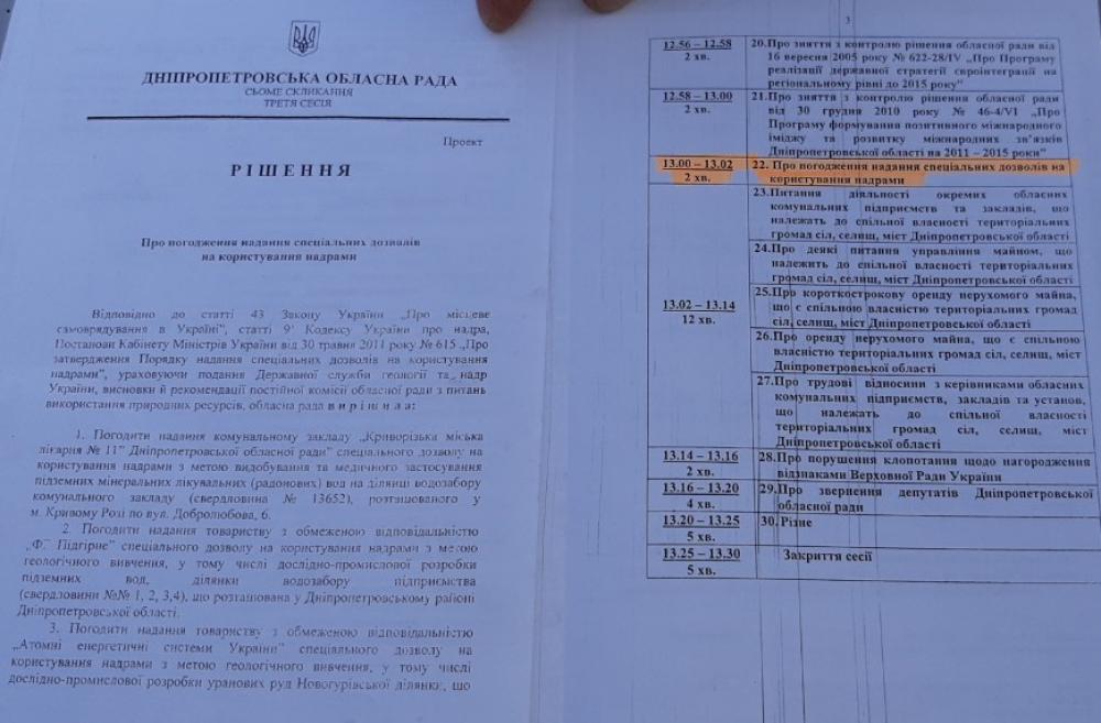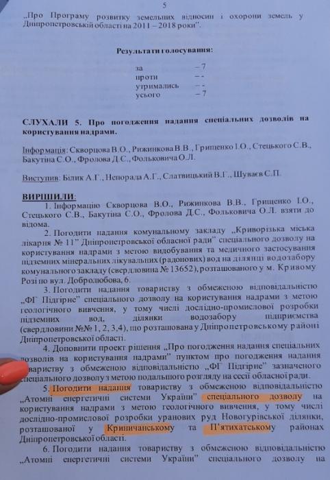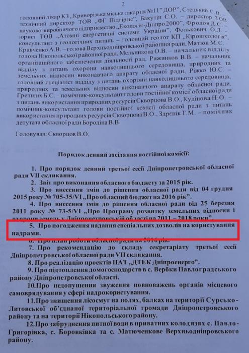 Як стало відомо, Постійна комісія обласної ради з питань використання природних ресурсів ще в 2016 році погодила надання спец.дозволу ТОВ "АЕСУ" на користування надрами в Дніпропетровській області, у Криничанскому і П’ятихатському районах. (див. Фотокопію нижче).