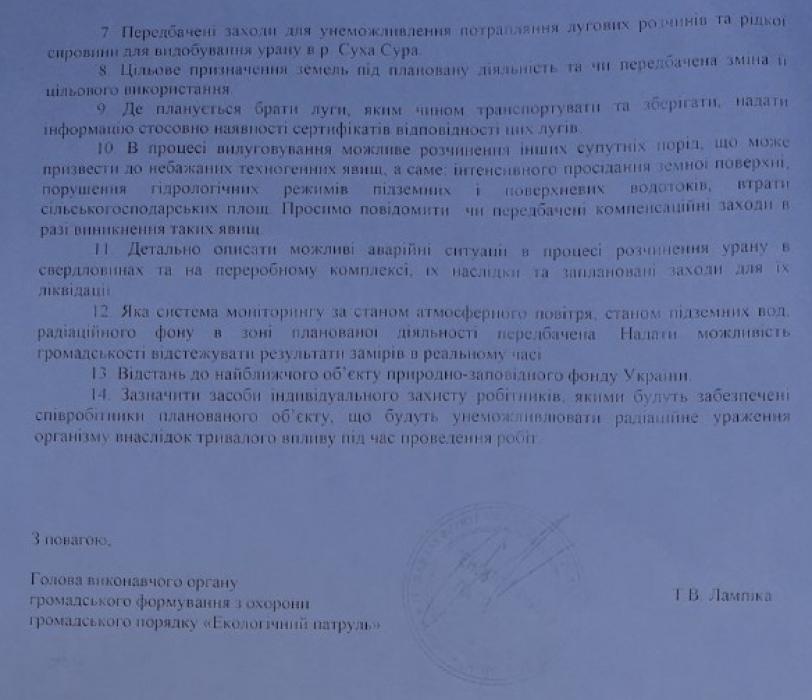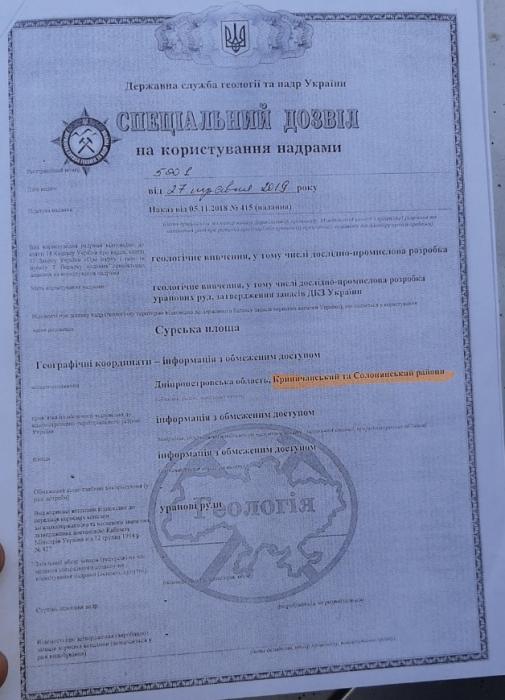 Але в даному "погодженні" немає жодної згадки про розробку уранових руд на Сурській ділянці Дніпровського району. В самому дозволі (див. Фото нижче) Дніпровський район теж не згадується.