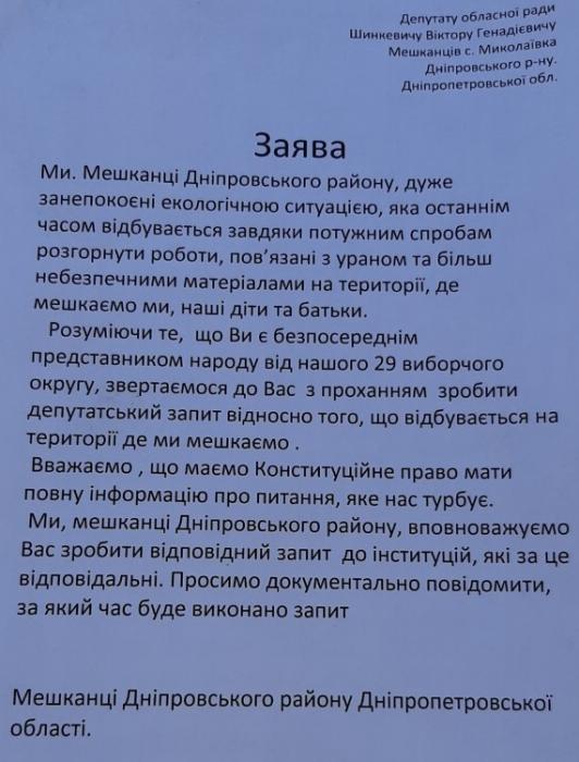 Нагадаємо, що 18 липня поточного року, мешканців с. Миколаївка-1, та прилеглих сіл, поставили перед фактом, що ТОВ "АЕСУ" розпочинають свою "планову діяльність" з видобутку корисних копалин, зокрема уранової руди, на межі сіл Миколаївка-1, і Сурське.